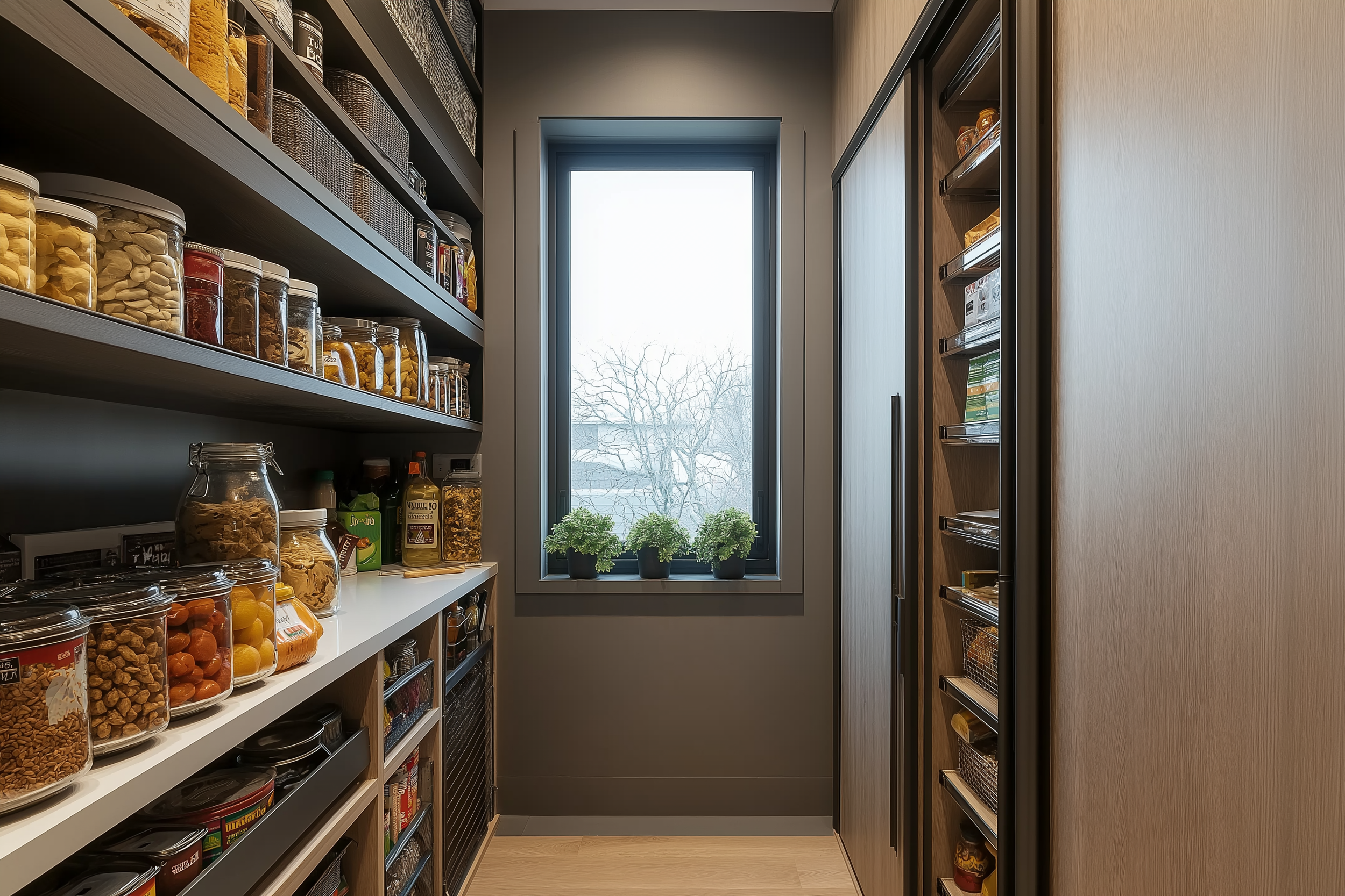 Potted herbs add a fresh touch, making this pantry not just a storage room but a functional part of your kitchen ecosystem. Seriously, who knew a pantry could have vibes?