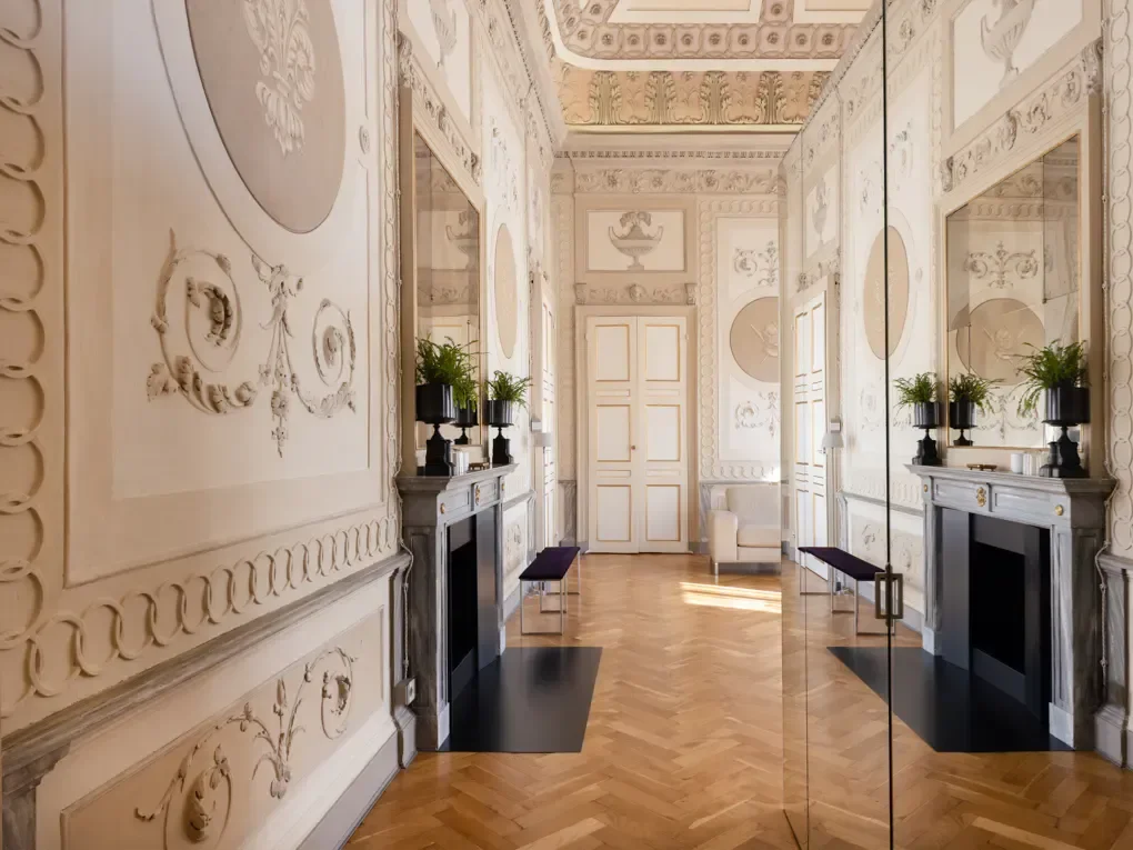 The centrepiece is a custom mirrored central volume, a sleek architectural intervention that quietly conceals the bedroom, kitchen, and bathroom behind reflective panels. It is contemporary design meeting centuries-old grandeur, and it works rather brilliantly. Concealed radiant-panel heating keeps things comfortable through Piedmont winters, and a cellar on the lower level adds useful storage for wine, luggage, or the usual accumulation of Italian life.