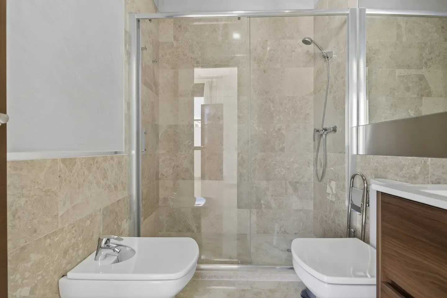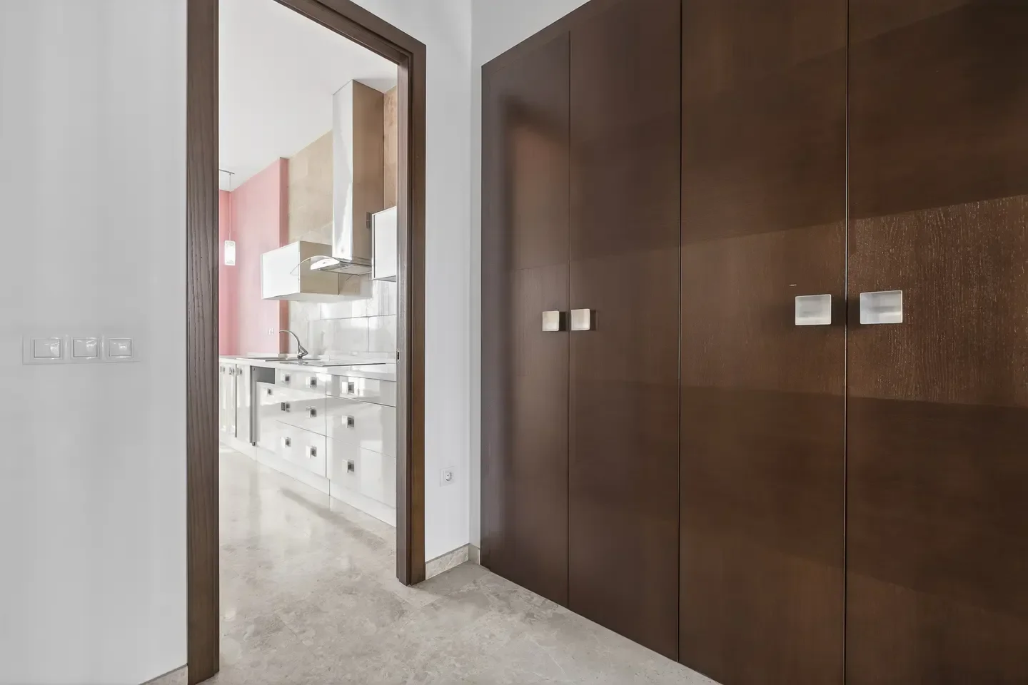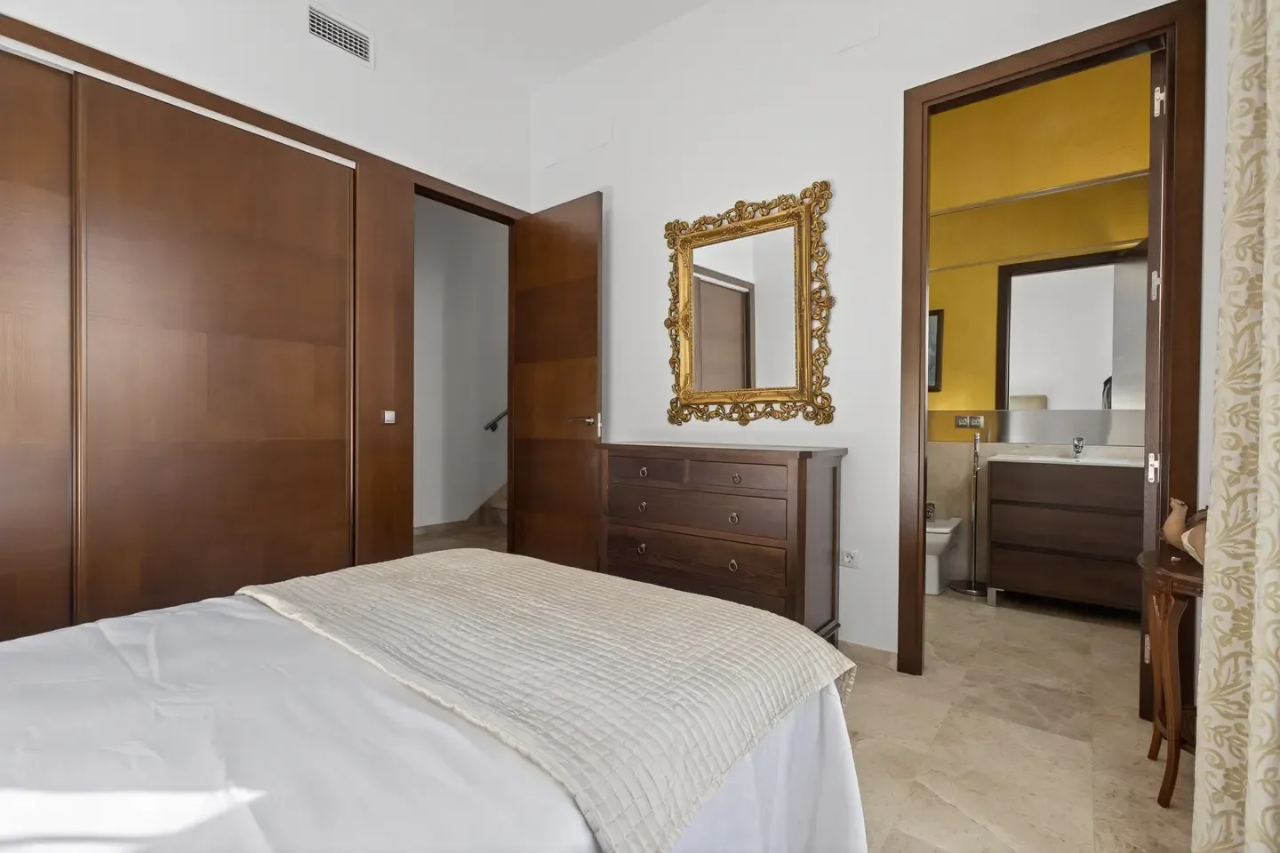 Two bedrooms on the ground floor come with en-suite bathrooms and built-in wardrobes; the master suite sits upstairs with views to the town hall plaza and enough privacy that you won't feel like you're on display.