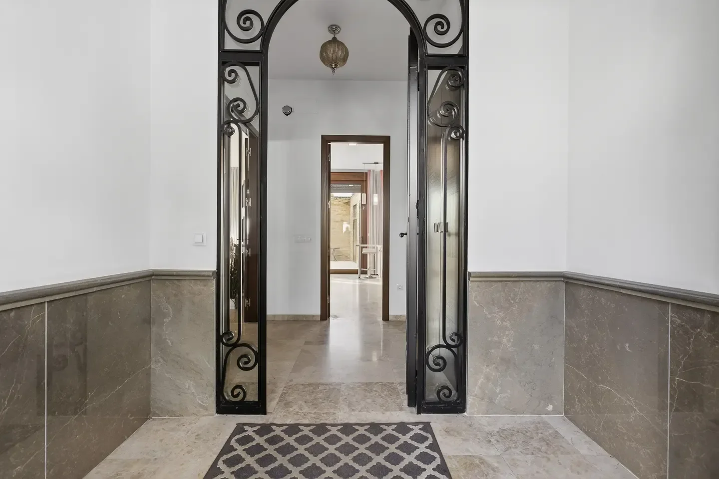 Features: Built 1940, restored 2014 · Two patios · Marble entrance · High ceilings · Central heating · Alarm system · Security door · Air conditioning · Built-in wardrobes · Master suite with town hall plaza views · Orange tree-lined street · Bus stop to Seville · Independent laundry room · Balcony · 15 minutes to Seville centre · Guadalquivir riverside location