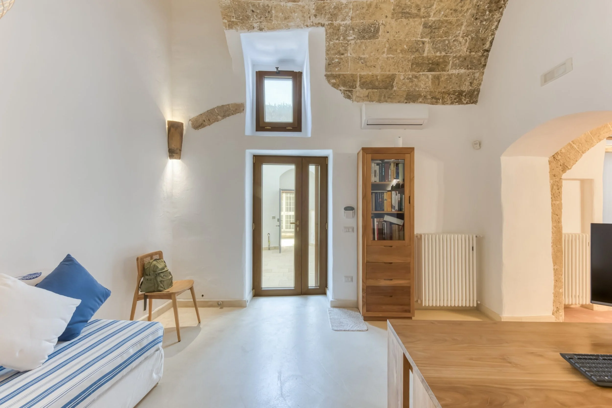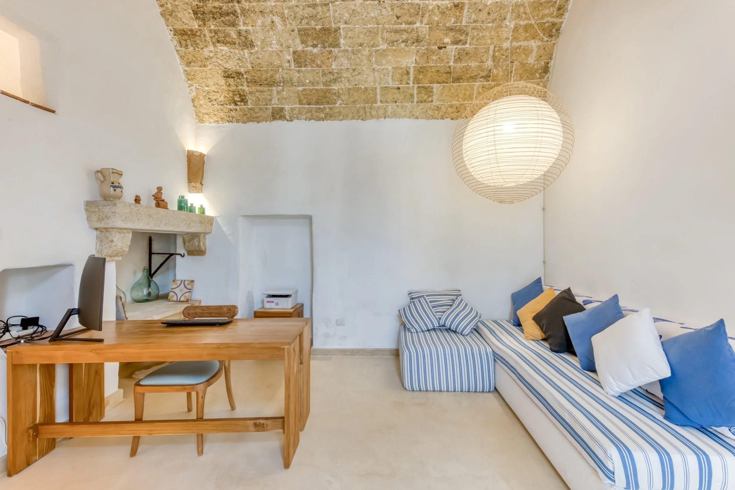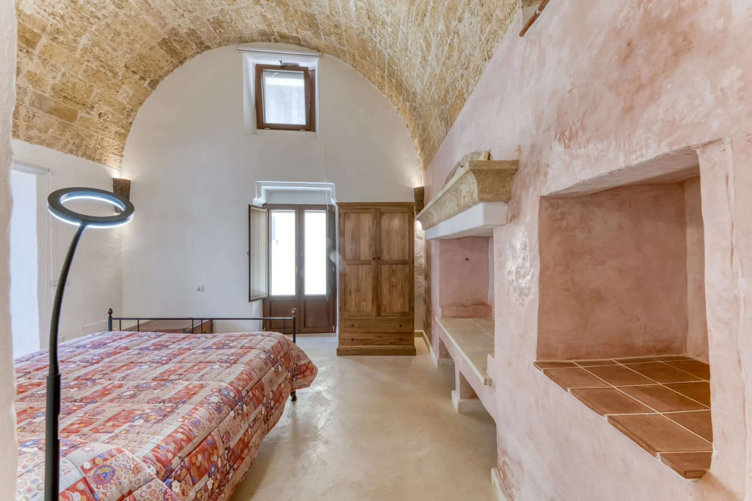 Two entrances from Via Torre: one leads to the internal courtyard, the other straight to the bedroom. The courtyard entrance opens into a large room with sitting area, office corner, period fireplace, and those barrel vaults doing their architectural thing.