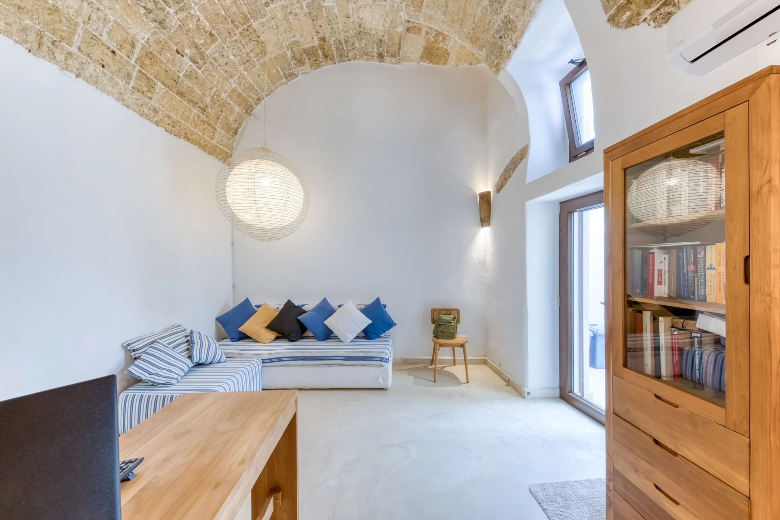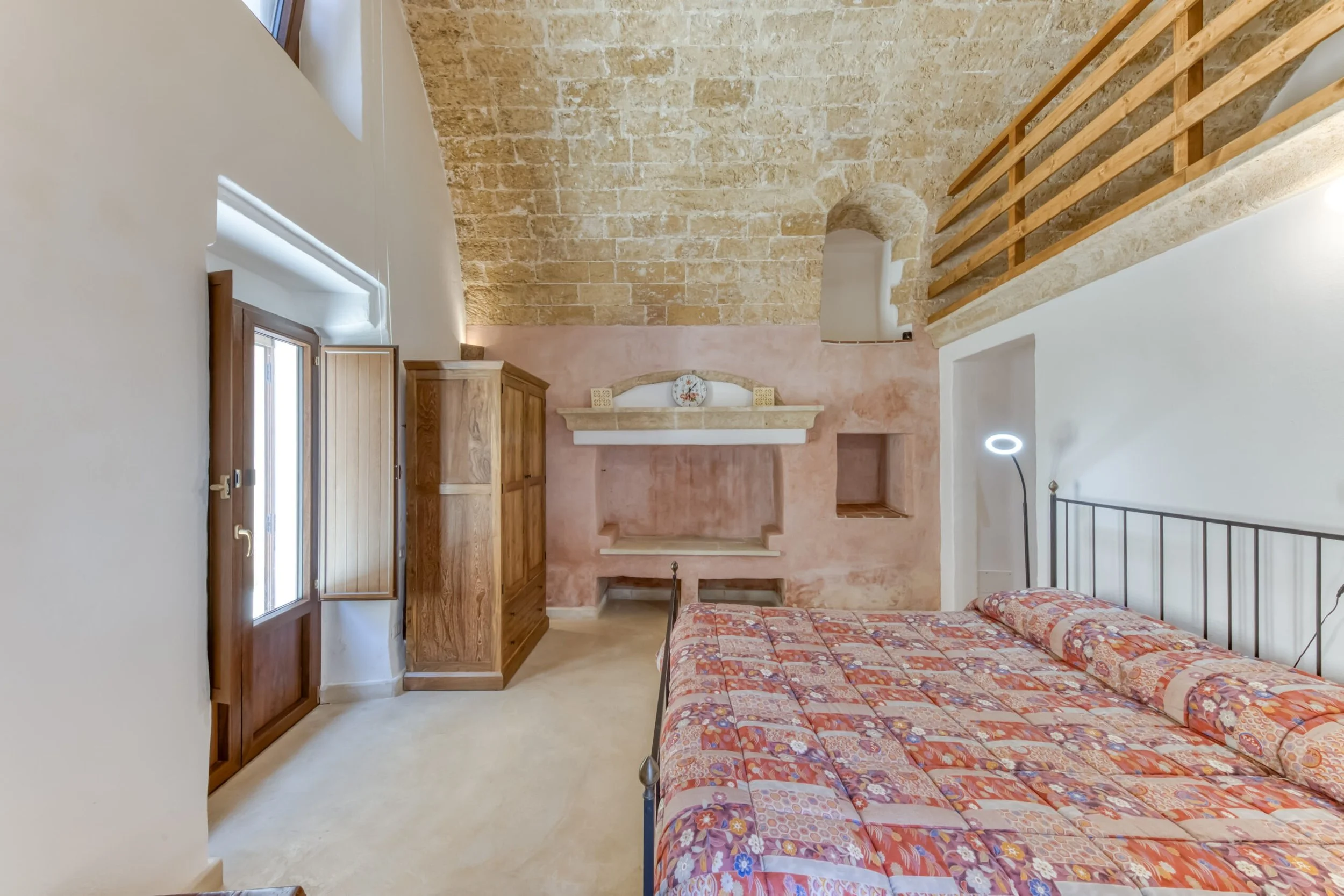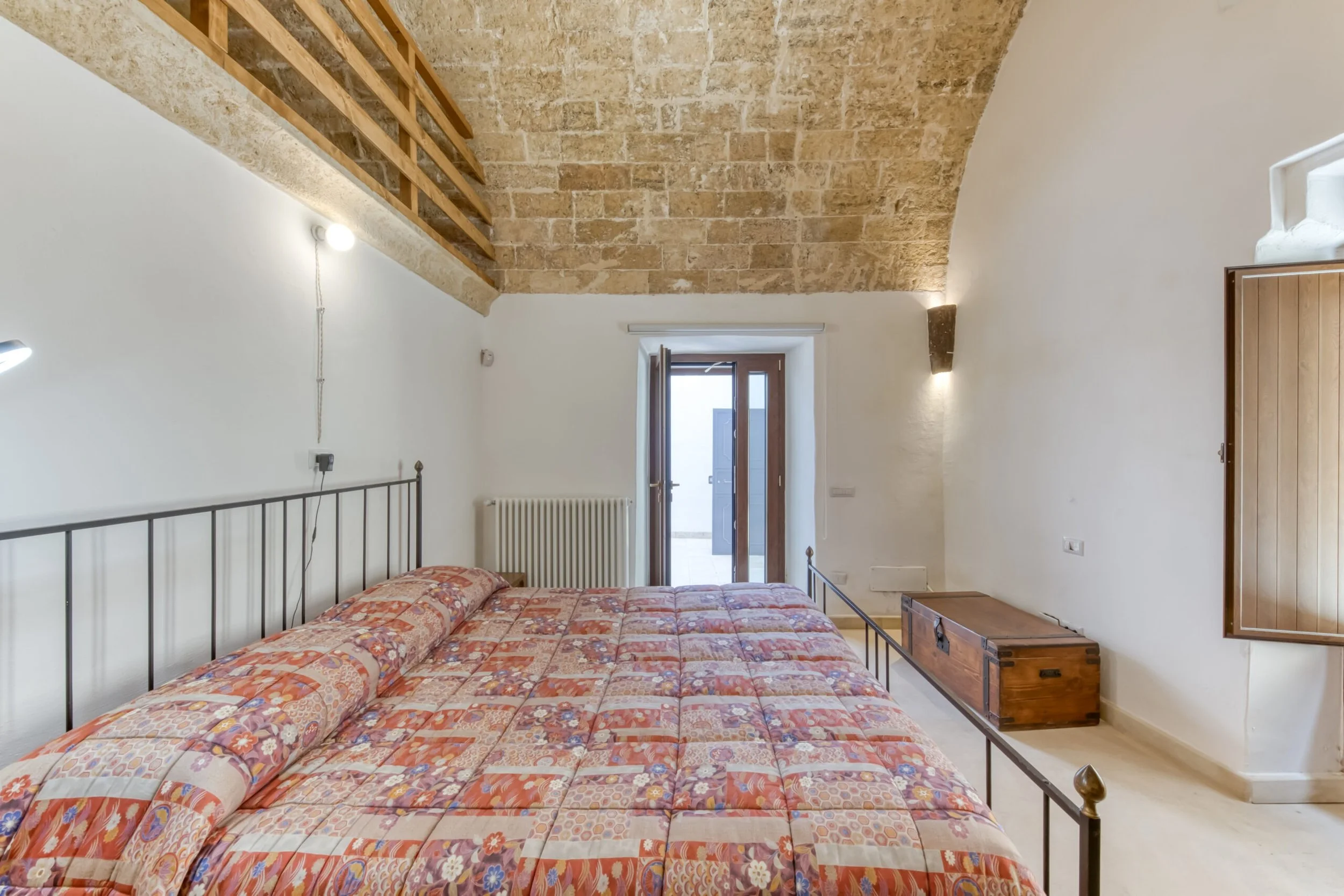 Two entrances from Via Torre: one leads to the internal courtyard, the other straight to the bedroom. The courtyard entrance opens into a large room with sitting area, office corner, period fireplace, and those barrel vaults doing their architectural thing.