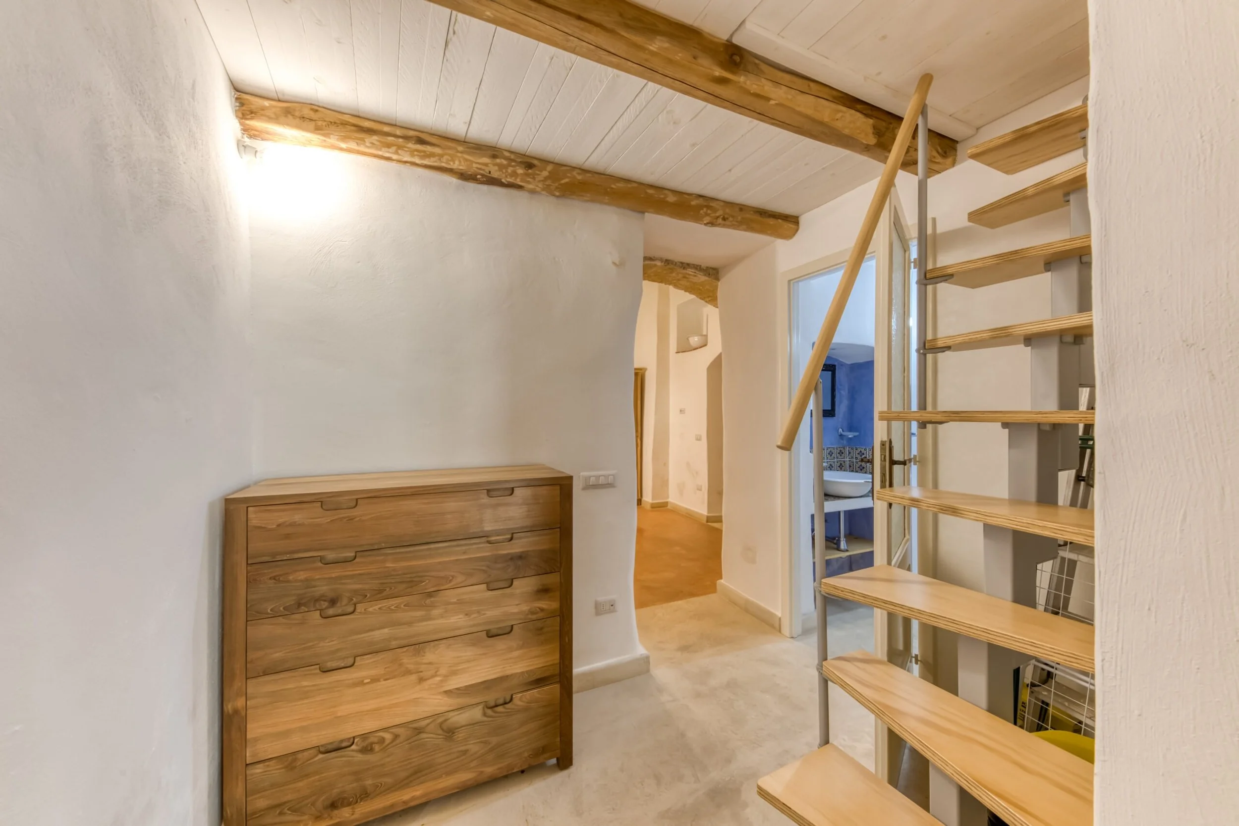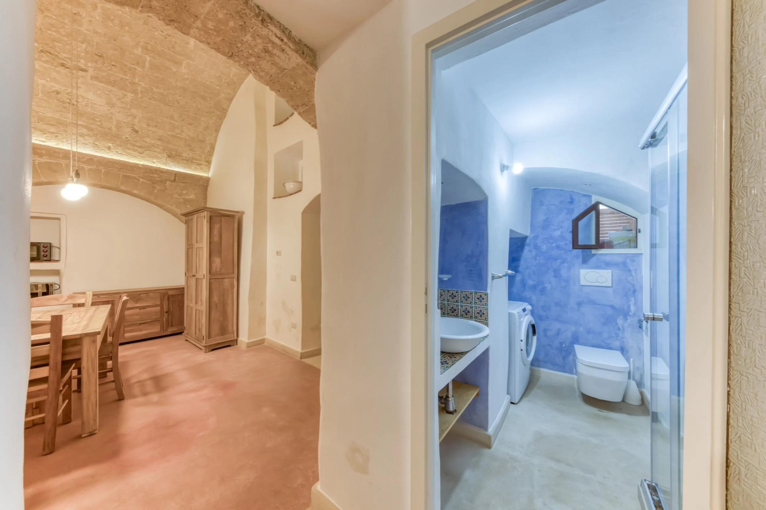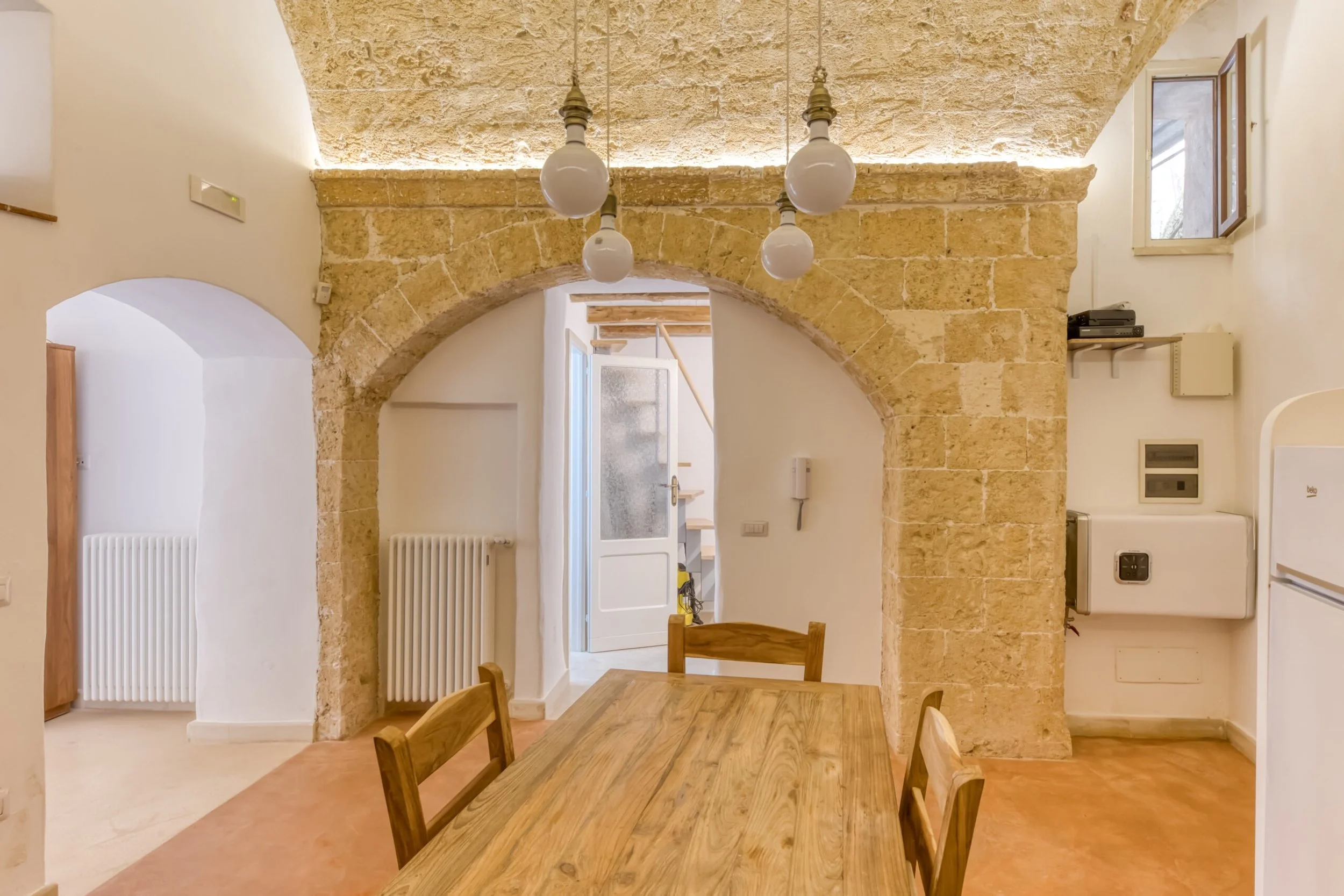 Next room functions as dining room with kitchenette, featuring two lateral arches and ancient niches discovered during renovation. Upstairs delivers a spacious double bedroom with functional mezzanine for storage or extra sleeping space. Bathroom and hallway connect living to sleeping areas.