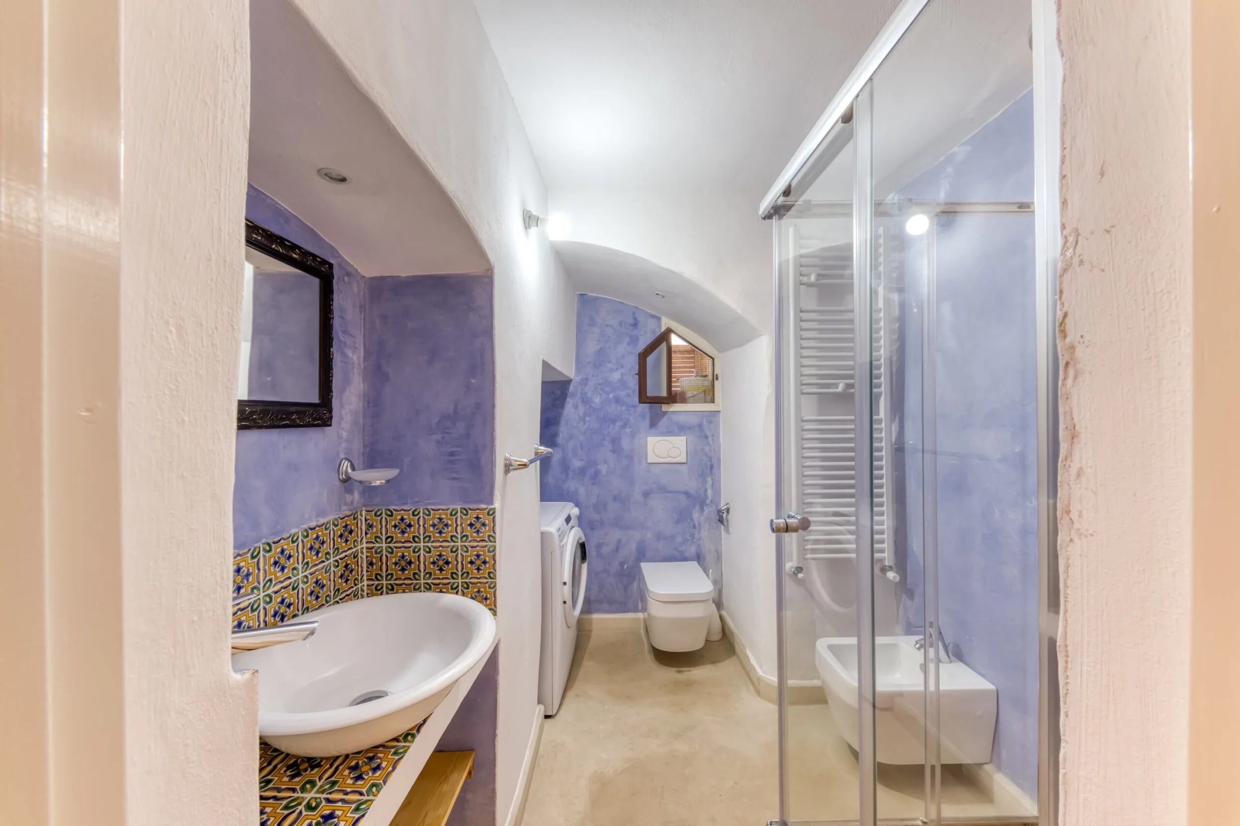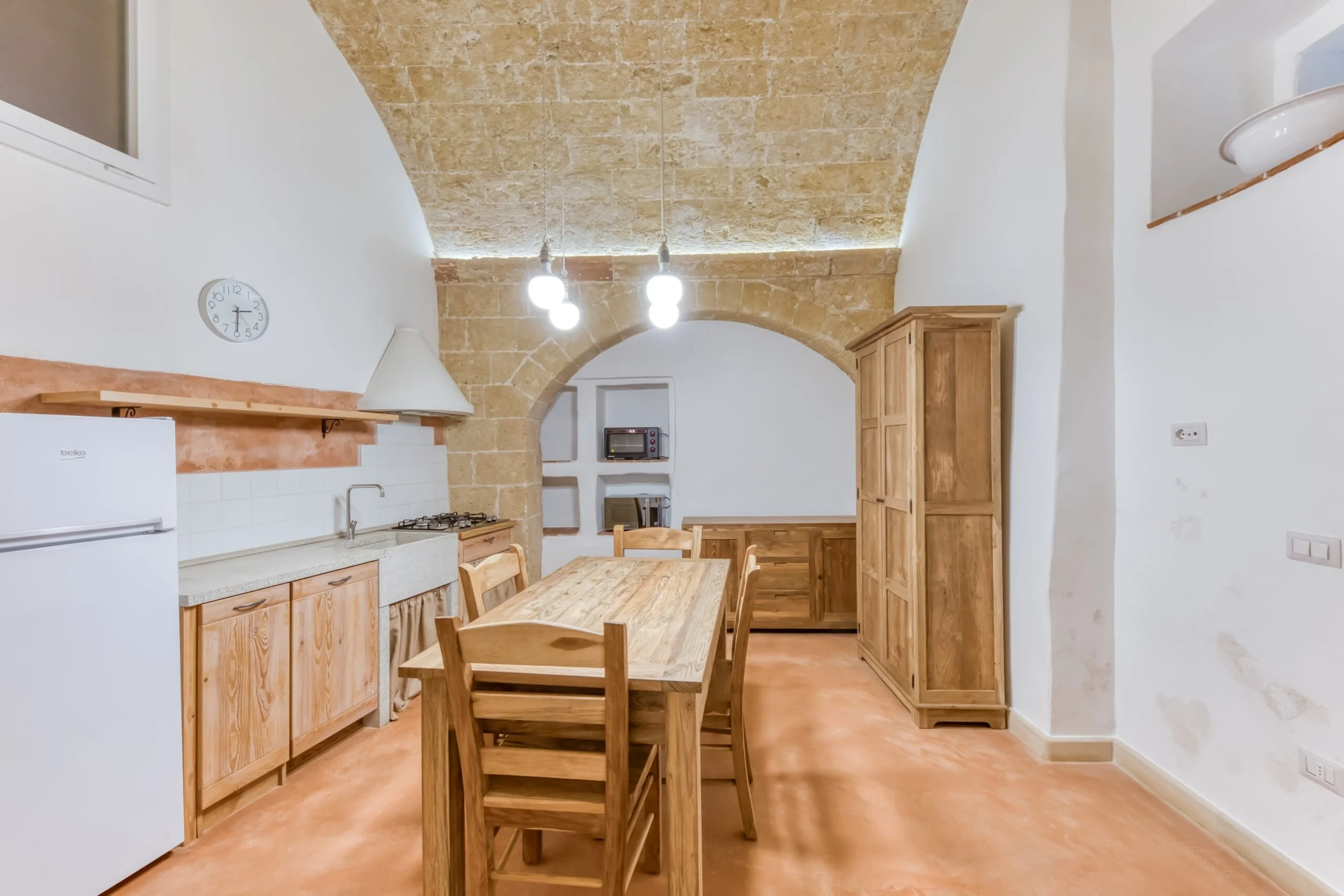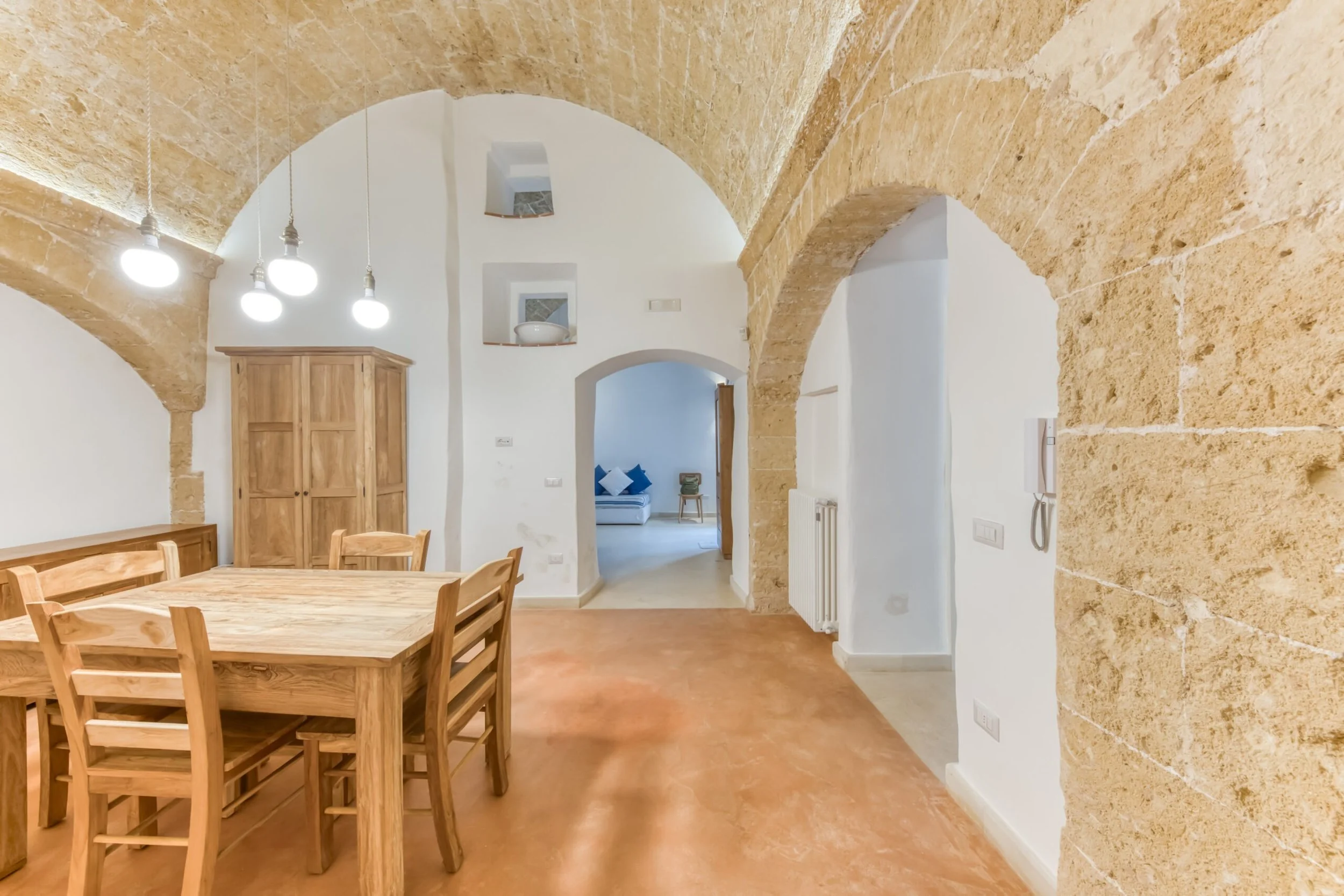 Next room functions as dining room with kitchenette, featuring two lateral arches and ancient niches discovered during renovation. Upstairs delivers a spacious double bedroom with functional mezzanine for storage or extra sleeping space. Bathroom and hallway connect living to sleeping areas.