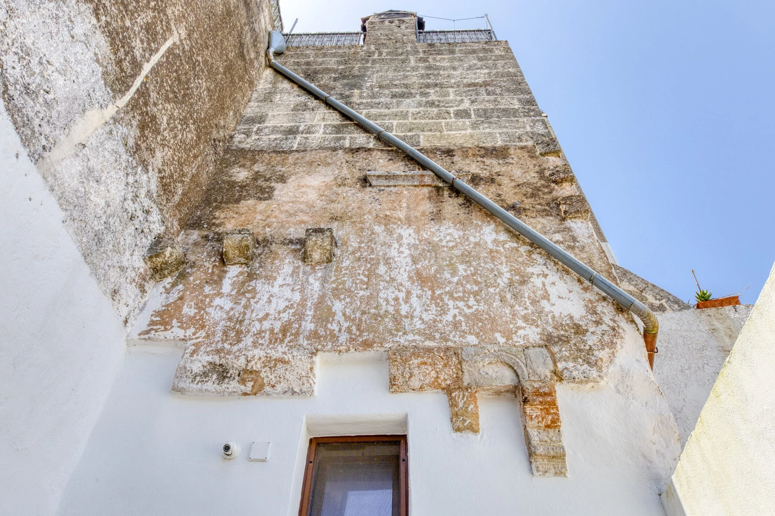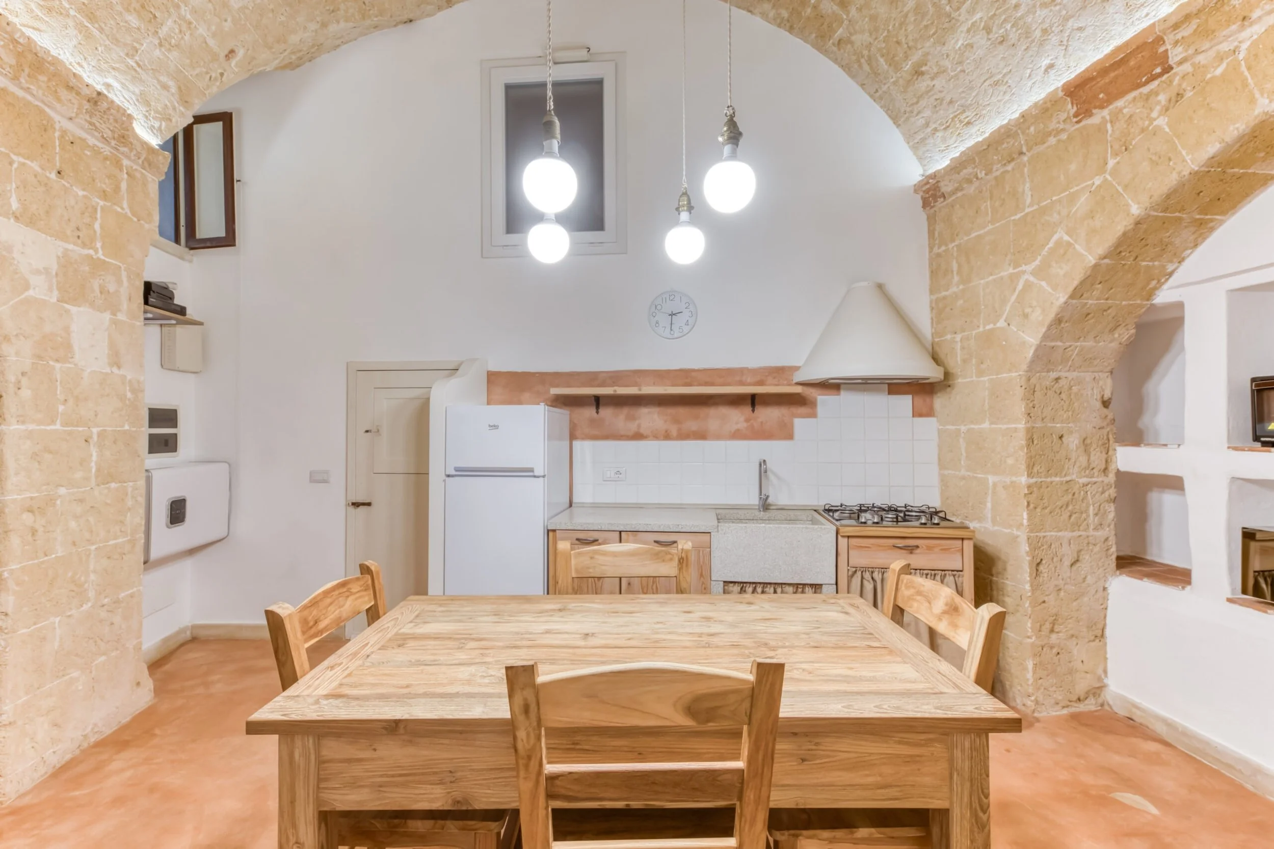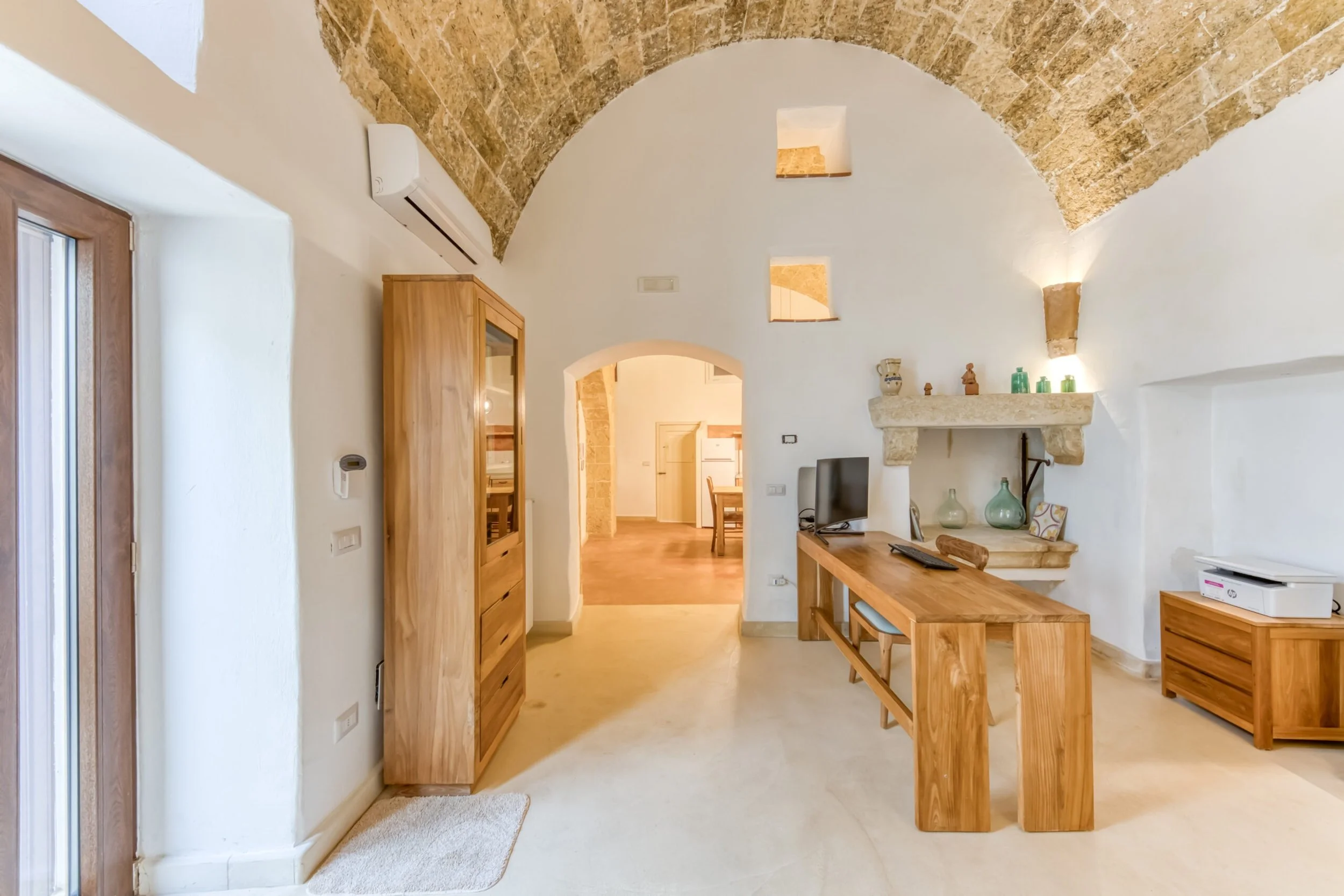 Features: Stone barrel vaults · Authentic period fireplace · Mezzanine bedroom · Ancient niches · Two entrances · Cocciopesto terracotta floors · Fully renovated · Furnished with recycled teak · Heat pump cooling · Methane heating · Alarm system · Smart working cabling · Minutes from Ionian and Adriatic coasts · 180m above sea level · Messapian walls (4th-3rd century BC) nearby