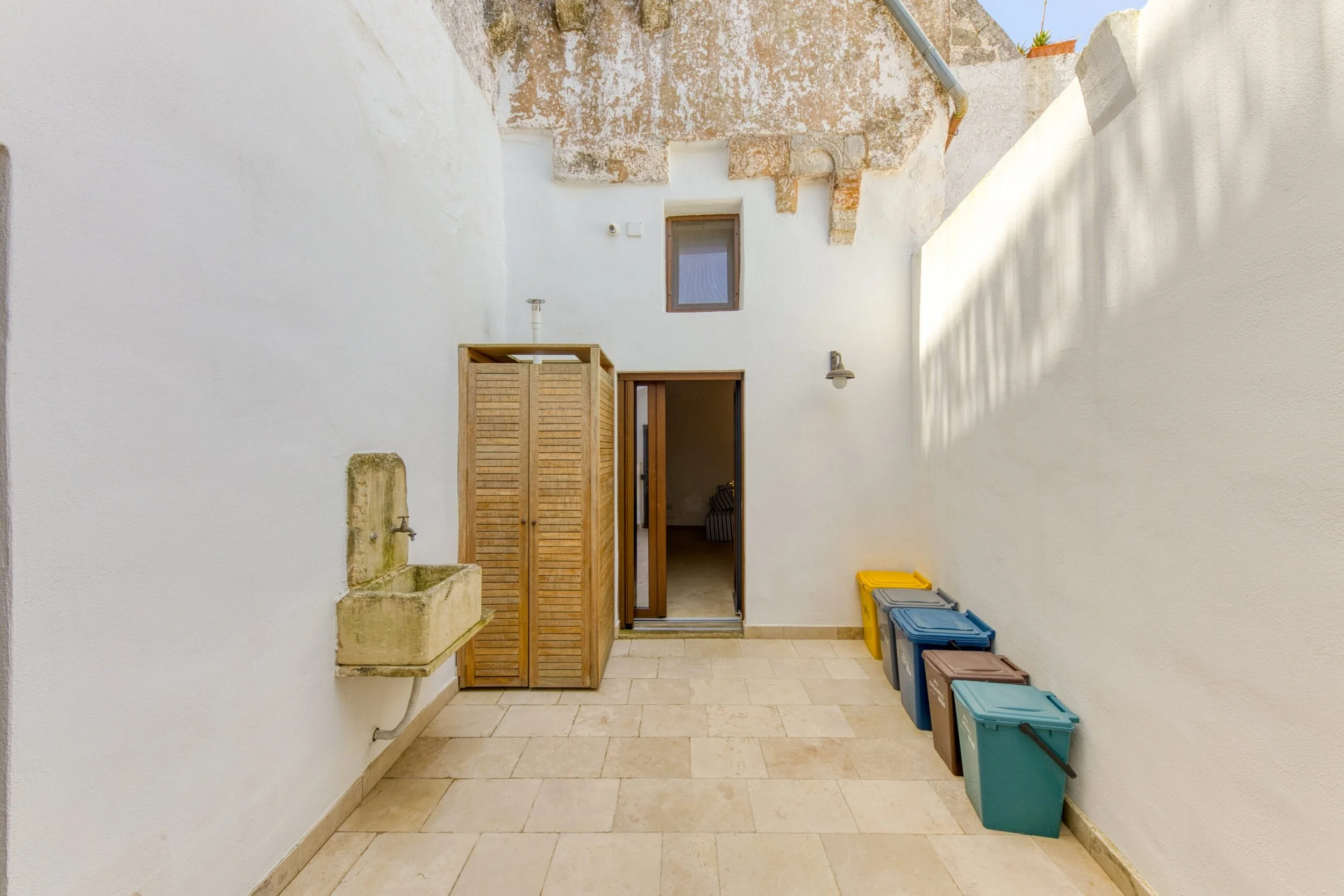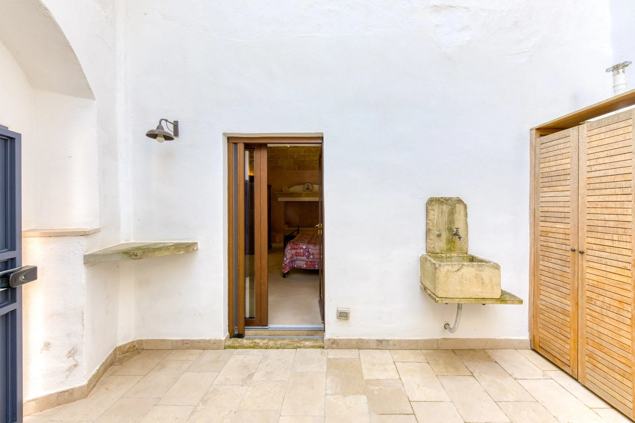 Sold furnished with handcrafted furniture in recycled antique teak designed for Salento tradition. Complete cabling for smart working, alarm system, heat pump cooling (though the house stays naturally cool), methane heating with steel radiators, auxiliary water pump for summer. Everything's sorted.