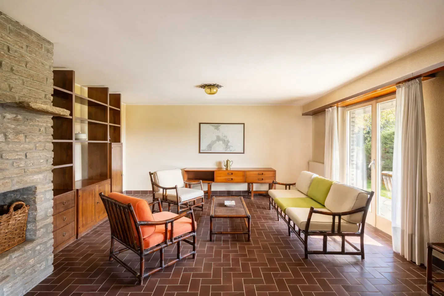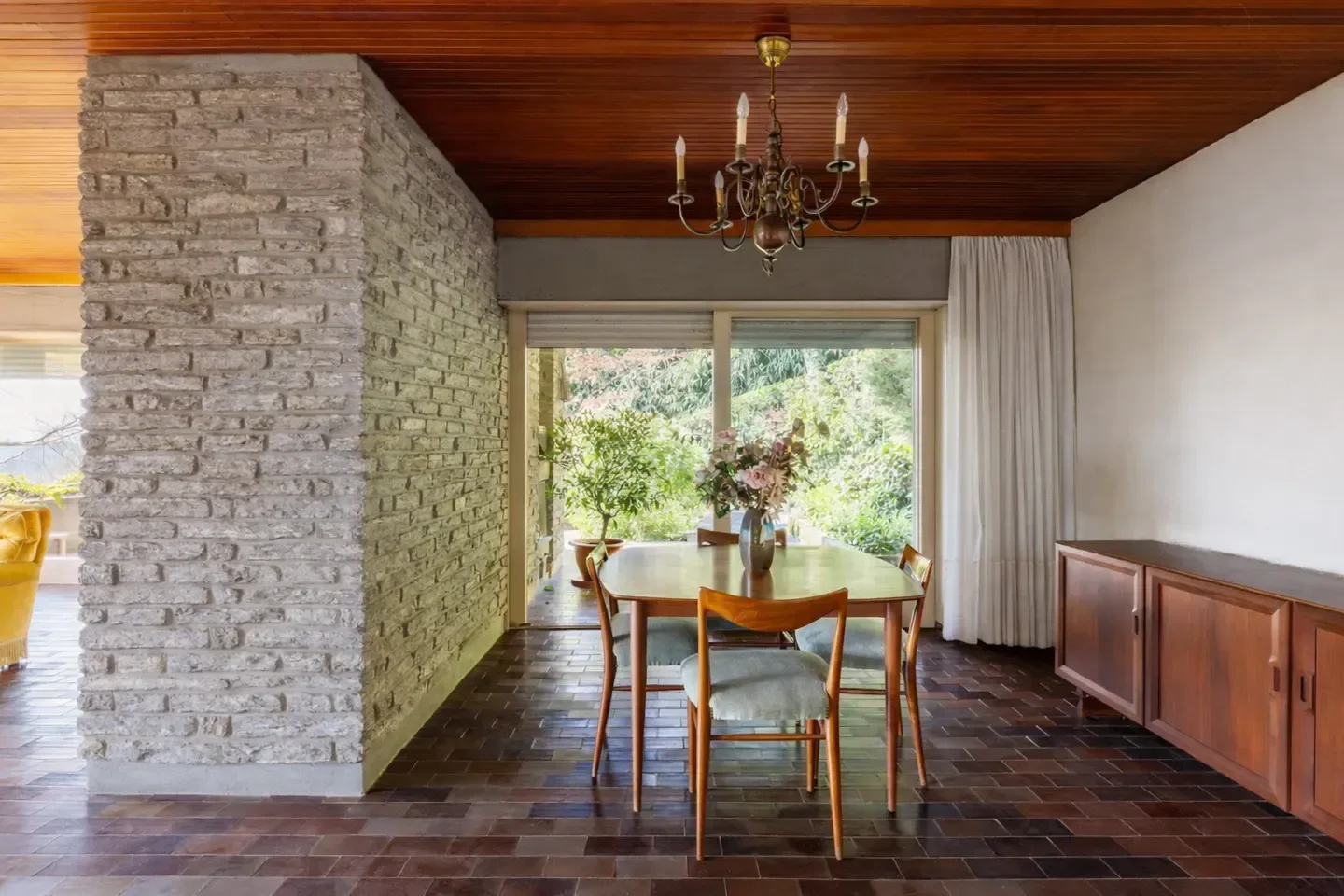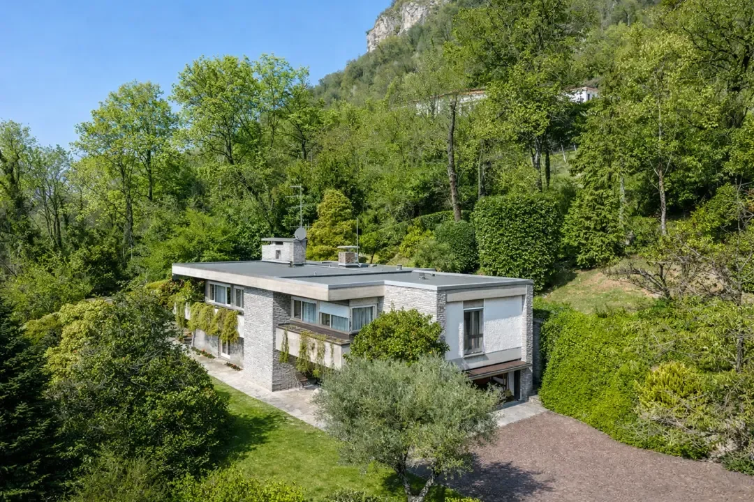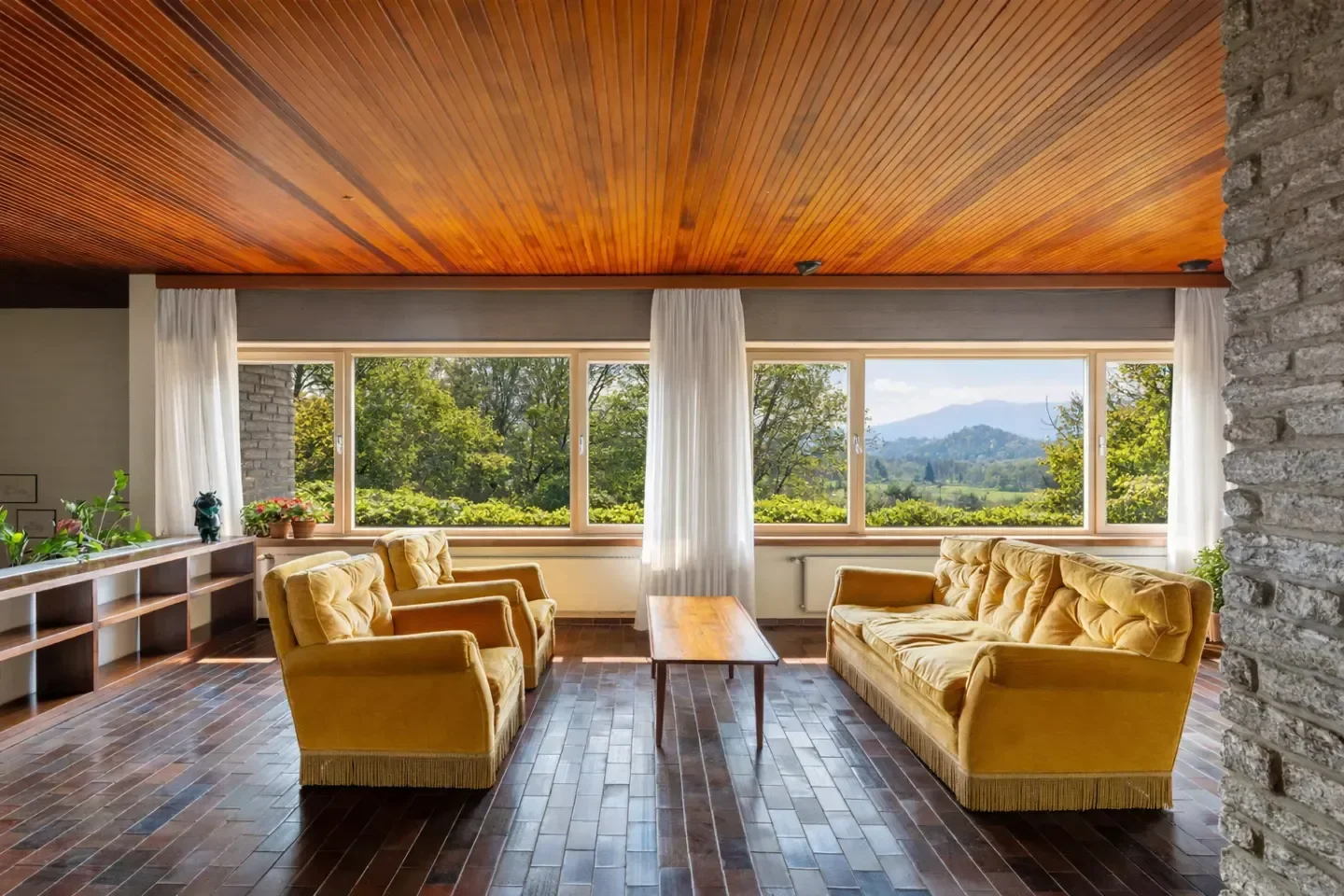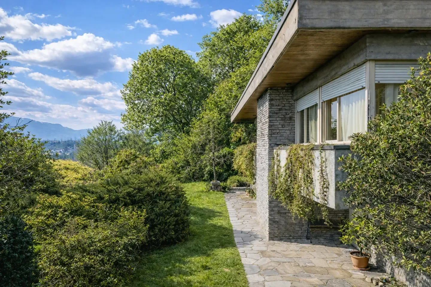 Bold architectural lines, natural stone cladding, and a lush private garden spanning over 2,290 m²: this four-bedroom villa in Sangiano is not your average Italian hideaway. The interiors combine parquet and tile flooring across 312 m² of living space, with a mid-century modern sensibility that feels considered rather than accidental.