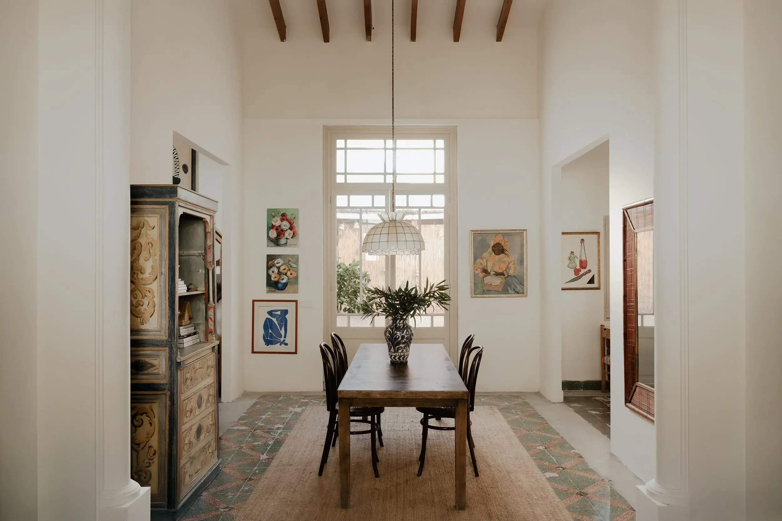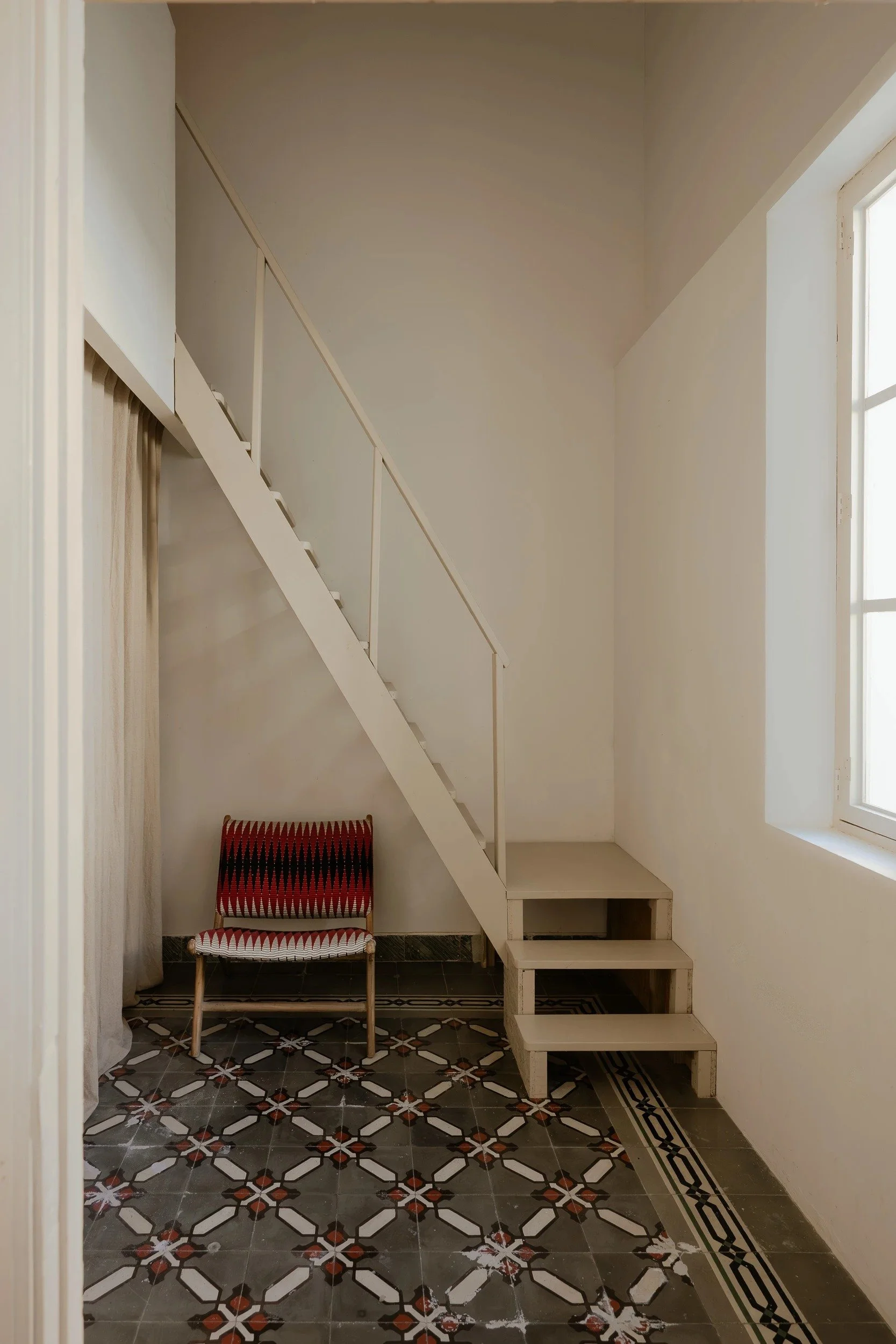 The result is quietly poetic rather than showy: original hydraulic tiles, exposed beams, a sculptural stone washbasin, all held together by soft natural tones and Mediterranean light flooding through spaces with ceilings reaching 5.4 metres.