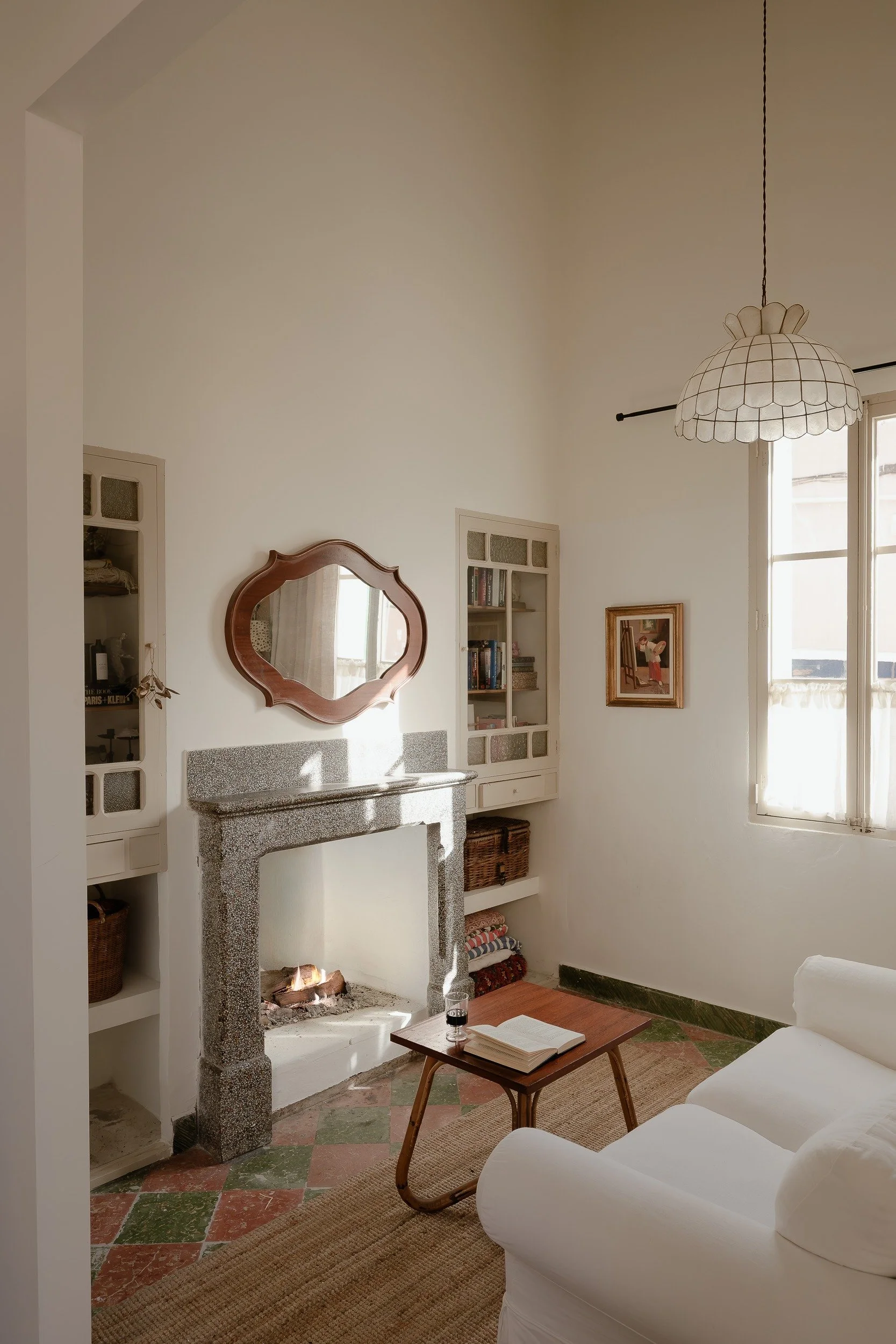 The restoration preserved everything worth keeping: handcrafted tiles, built-in elements, restored wood details. The open fireplace anchors the living room.