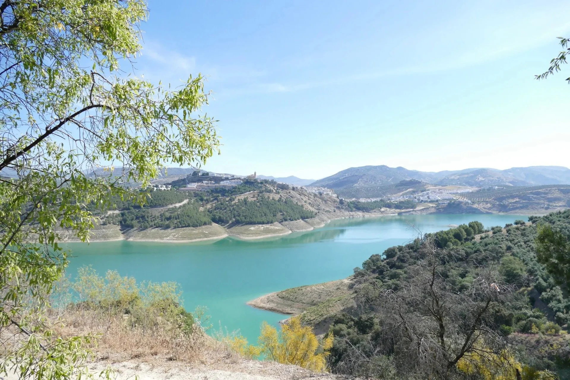 Two terraces upstairs give you those valley views, and the pool's got a garden and terrace that work year-round. The town itself is quiet, with a bar, restaurant, and small supermarket. Iznájar proper is ten minutes away when you need more than that: bars, restaurants, cocktail bars, schools, the works. The lake's right there for water activities if that's your thing.