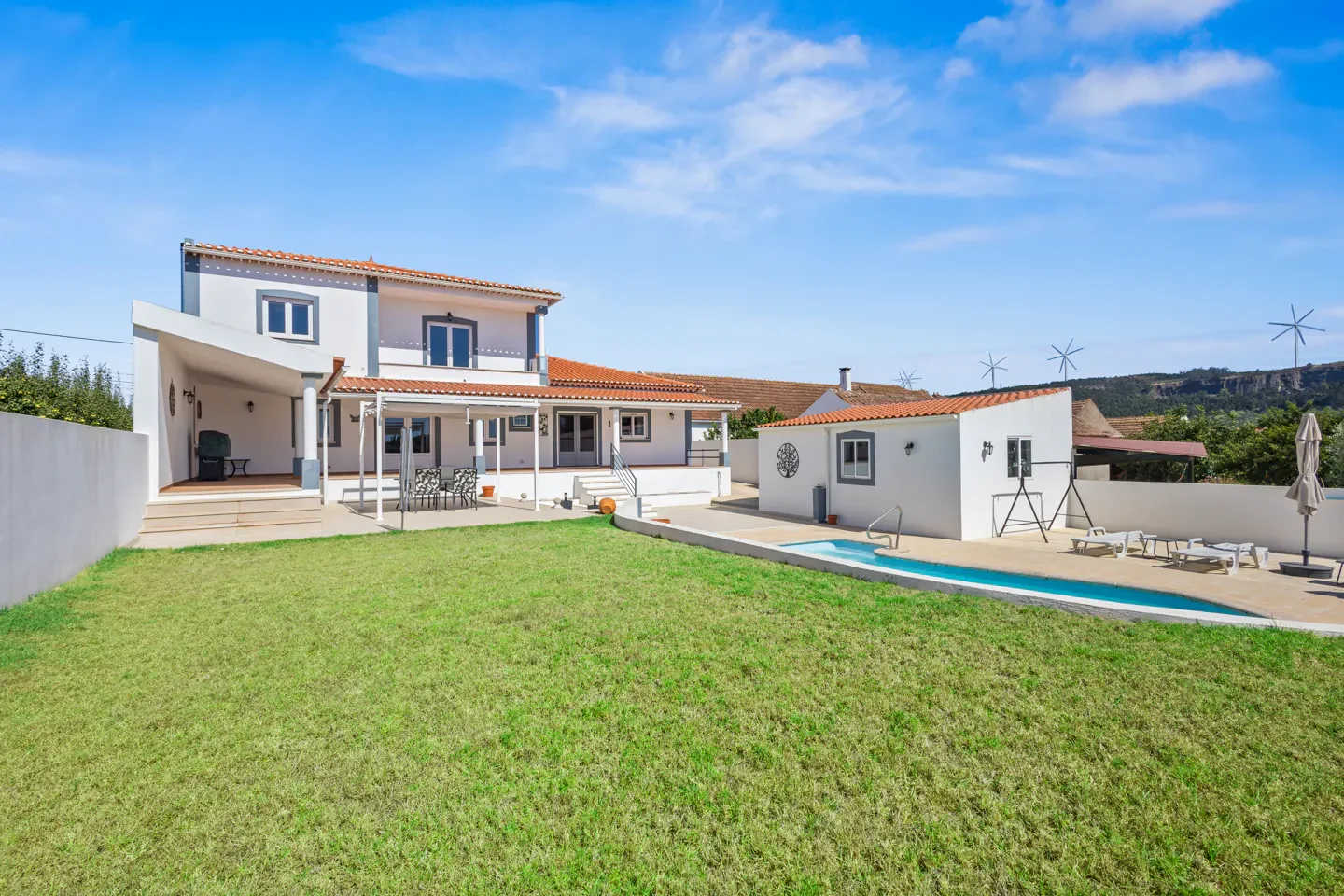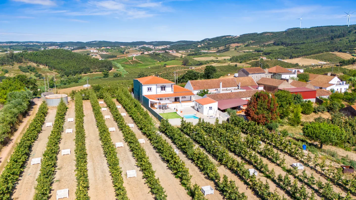 Features: Built 2003, renovated 2018 · Traditional Portuguese architecture · Private swimming pool · 750 m² plot · 2 suite bedrooms · Central pellet heating · Built-in kitchen · Garage for 1 car · Balcony · Patio · Terrace · Attic · Mountain views · Green views · Open countryside views · Guest toilet · 15 minutes to Caldas da Rainha · 20 minutes to Silver Coast beaches · 1 hour to Lisbon · A15 and A8 motorway access