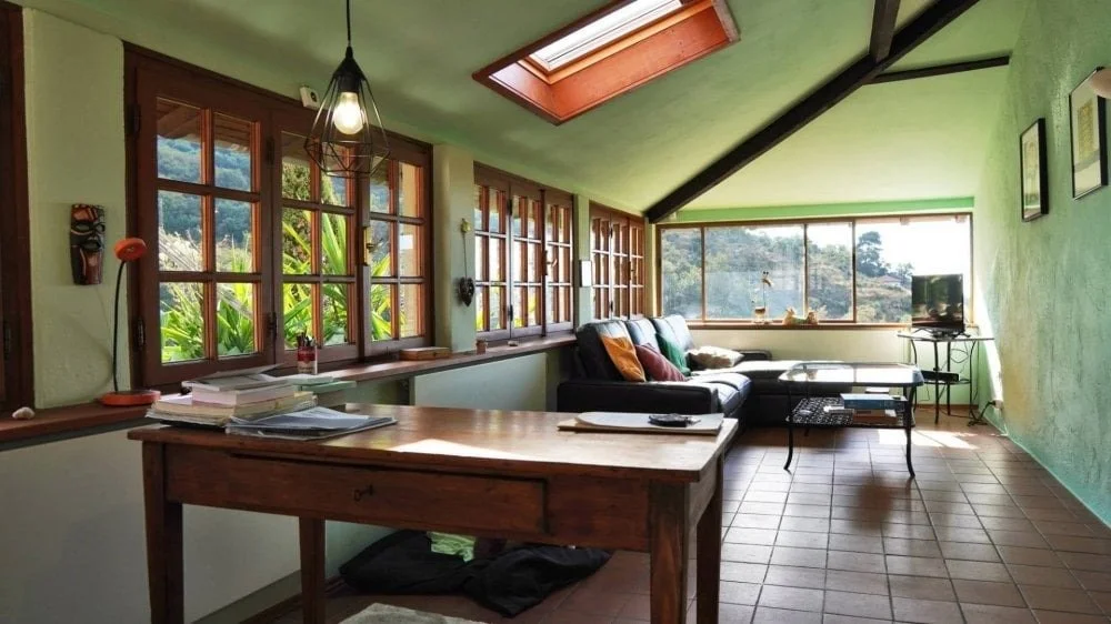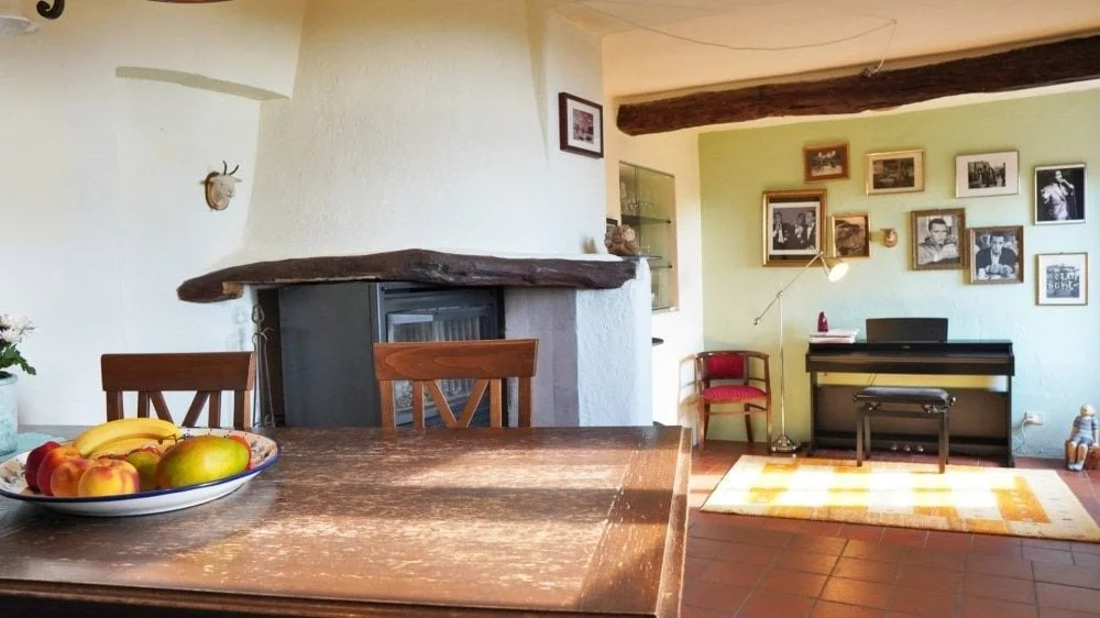 The house keeps its original character (exposed stone, period details, the works) but someone's already done the hard work of making it liveable. The living area's on the main level: spacious lounge with a fireplace for winter, a glass-enclosed veranda that frames the valley views, and a fully equipped kitchen.