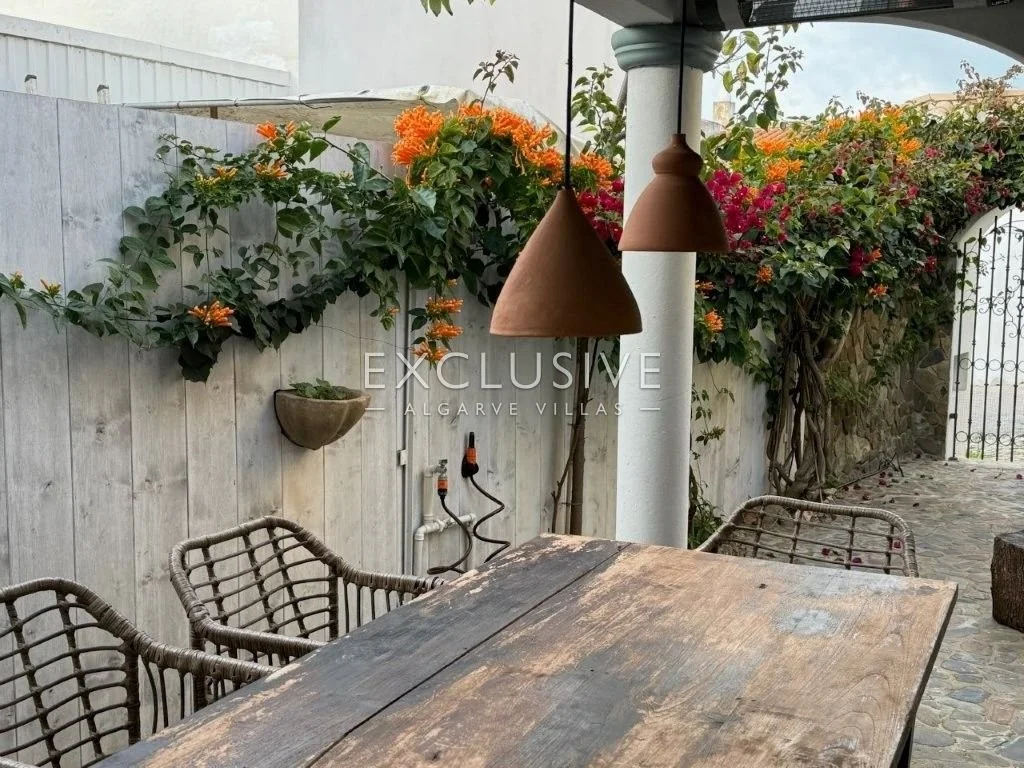 Features: Built 2004 · Courtyard garden with dining areas · Fully equipped outdoor kitchen · Ground floor: open-plan kitchen/living area, cloakroom · First floor: 2 bedrooms, modern shower room · Narrow spiral staircase to roof terrace · Chimney top views · Traditional charm with modern touches · 8 minutes walk to Estômbar train station · Trains to Lagos, Silves, Faro (Lisbon with one change) · Near amenities, golf courses, beaches