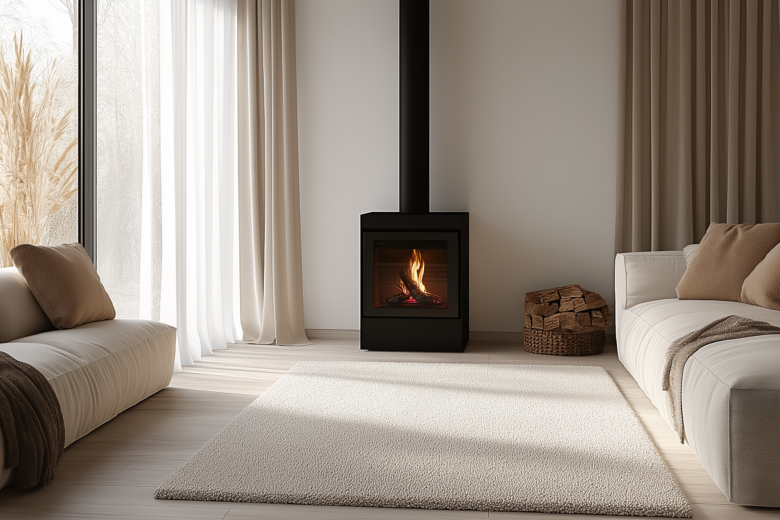 Nothing beats the look of flames flickering in a sleek, modern stove while the soft natural light streams in through those large windows. It's like the fireplace is the beating heart of the room, creating the perfect atmosphere for those moments when you just want to relax and let the world slow down.